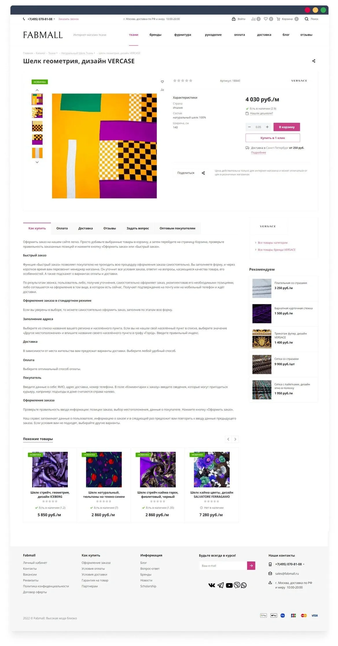 Цель: создать интернет магазин тканей и фурнитуры со стильным дизайном, понятным интерфейсом и удобной навигацией. Сделать его конкурентоспособным для бизнеса, качественным для поисковых систем и интересным для покупателей. Реализовать возможность загрузки товаров и предложений из 1С.